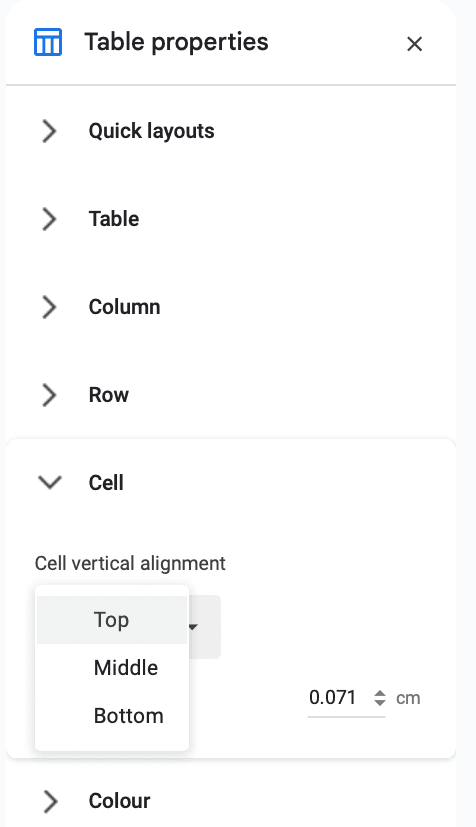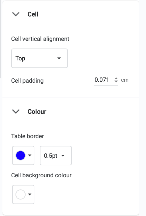 - Verander bij Table properties – Colour de Table border ook in donkerblauw en stel de lijndikte in op 0.5pt.