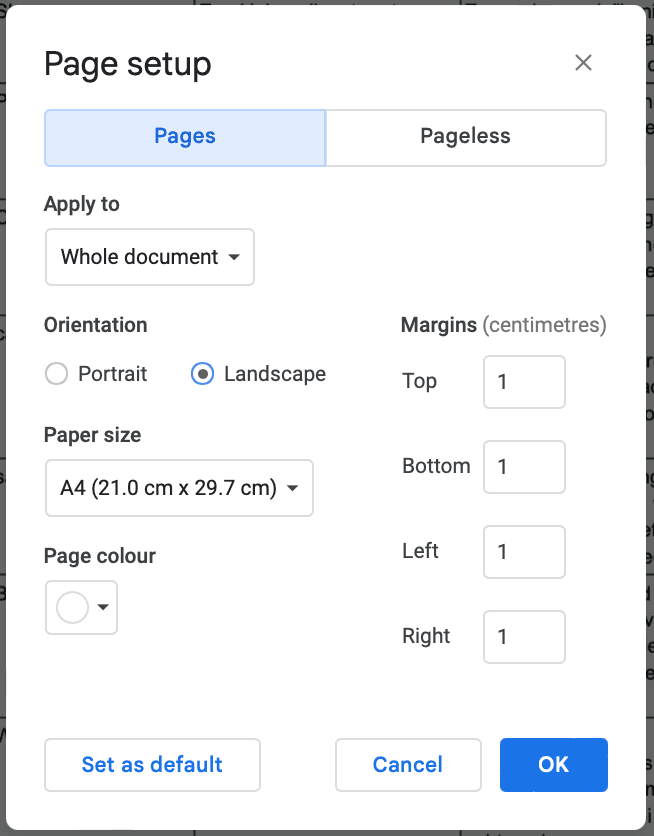 - In het dialoogvenster kies je onder Orientation de optie Landscape.