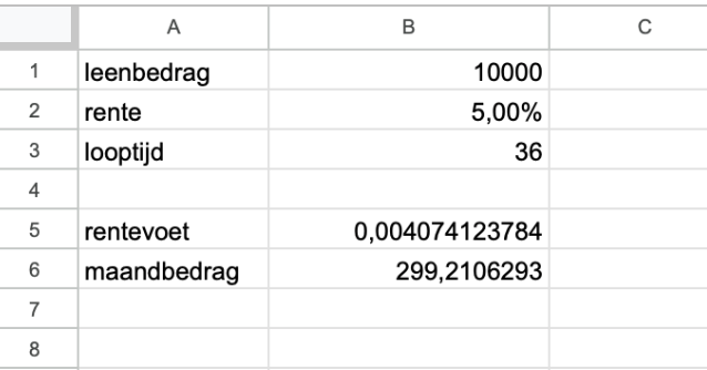 Het maandbedrag voor de lening bereken je dan met de volgende formule: