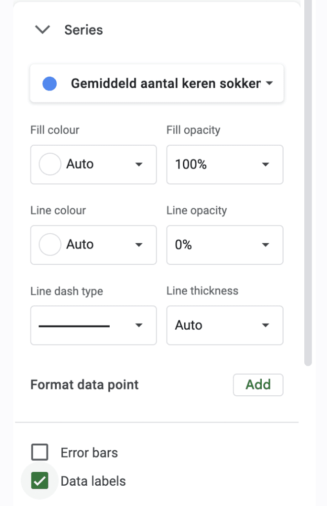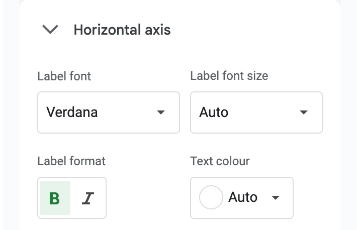 Kies fill colour: blue. - Bij de onderdelen Horizontal- en vertical axis kies je bij Label format: Bold