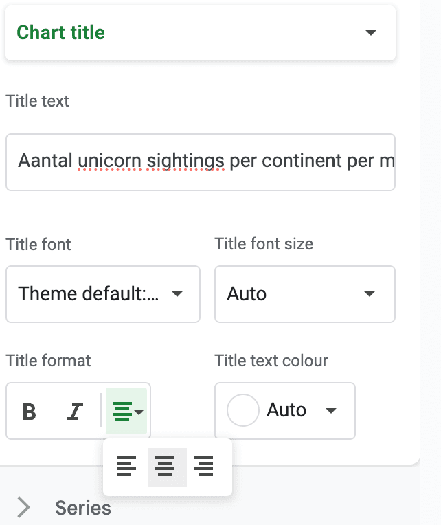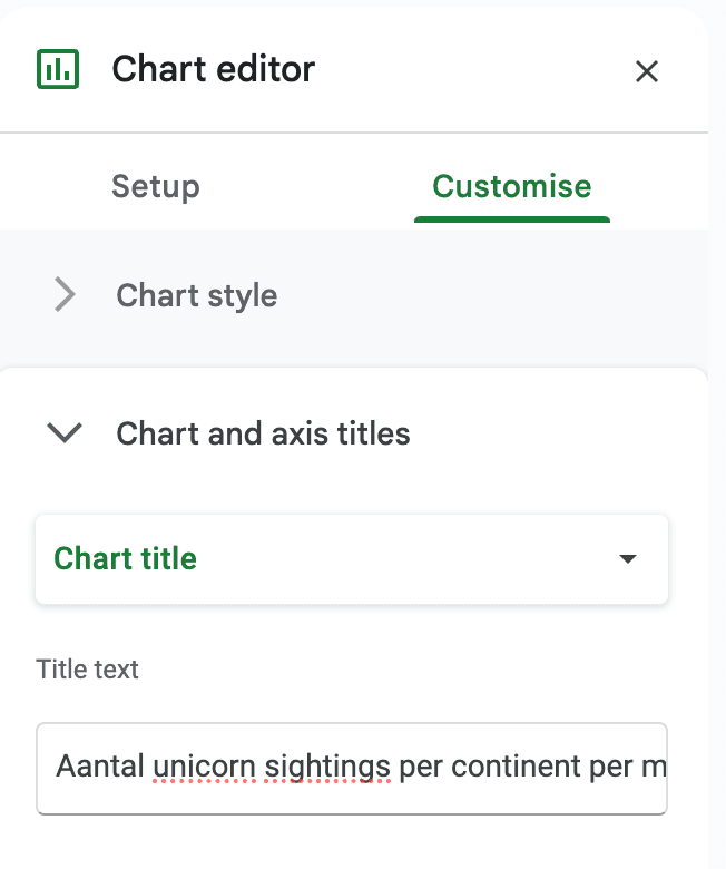 - Verander de Title text in: Aantal unicorn sightings per continent per maand.