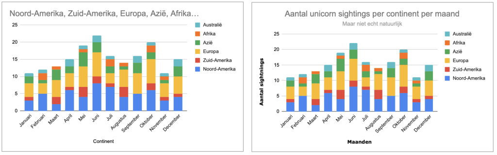 - Verander de Title text in: Aantal unicorn sightings per continent per maand.