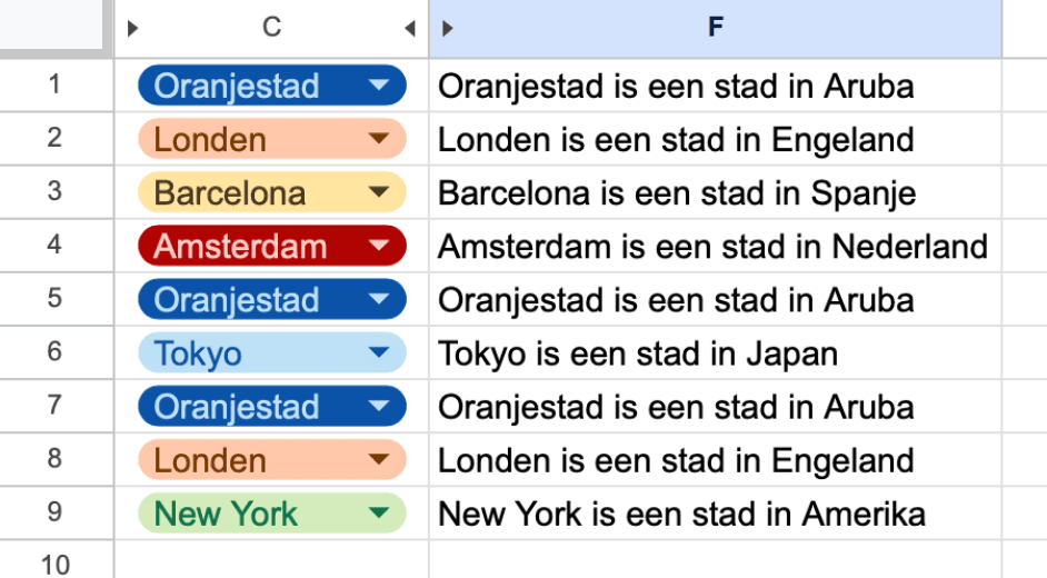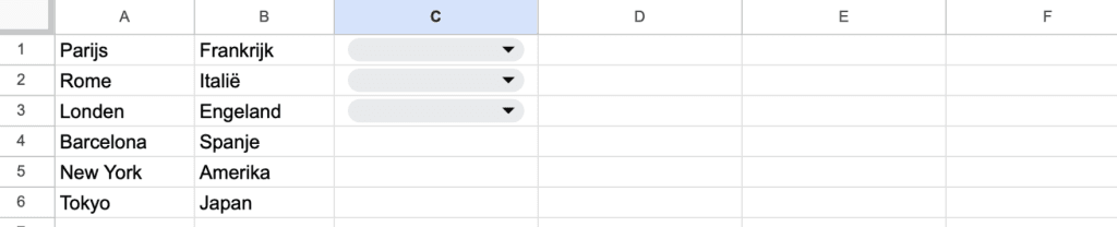 - Maak ook in kolom c extra dropdownenu’s erbij.