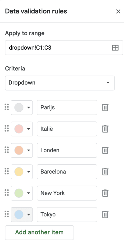 Het woord dropdown in de range is de naam_van_het_werkblad! - Vul de waarden die je in kolom a hebt gezet in als items in het dropdownmenu.
