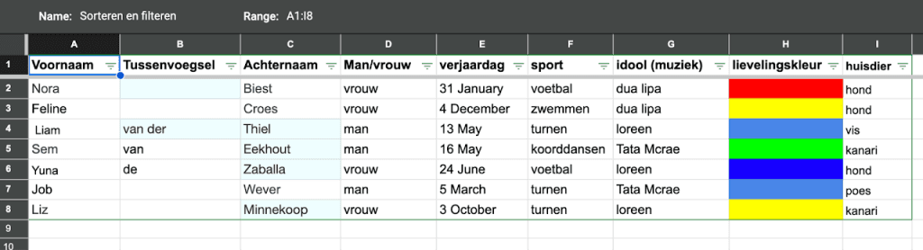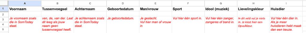 • Elke leerling typt in één van de rijën zijn of haar gegevens in de juiste kolom.