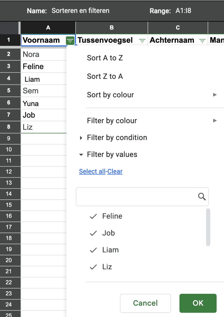 • Klik achter voornaam op het ordenen-icoontje en probeer de sorteren-opties uit.
