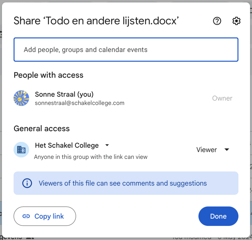- Controleer bij Delen of Het Schakel College is ingesteld als viewer