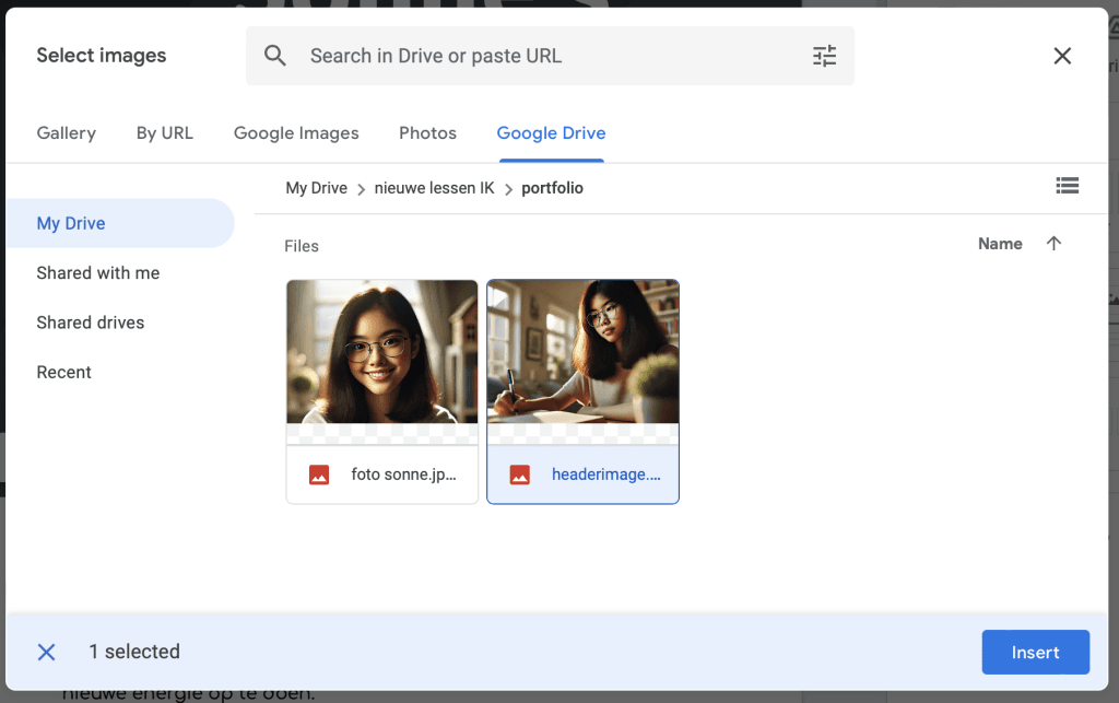 - Klik in het dialoogvenster op Google Drive en zoek daar de foto die je voor de header wilt gebruiken.