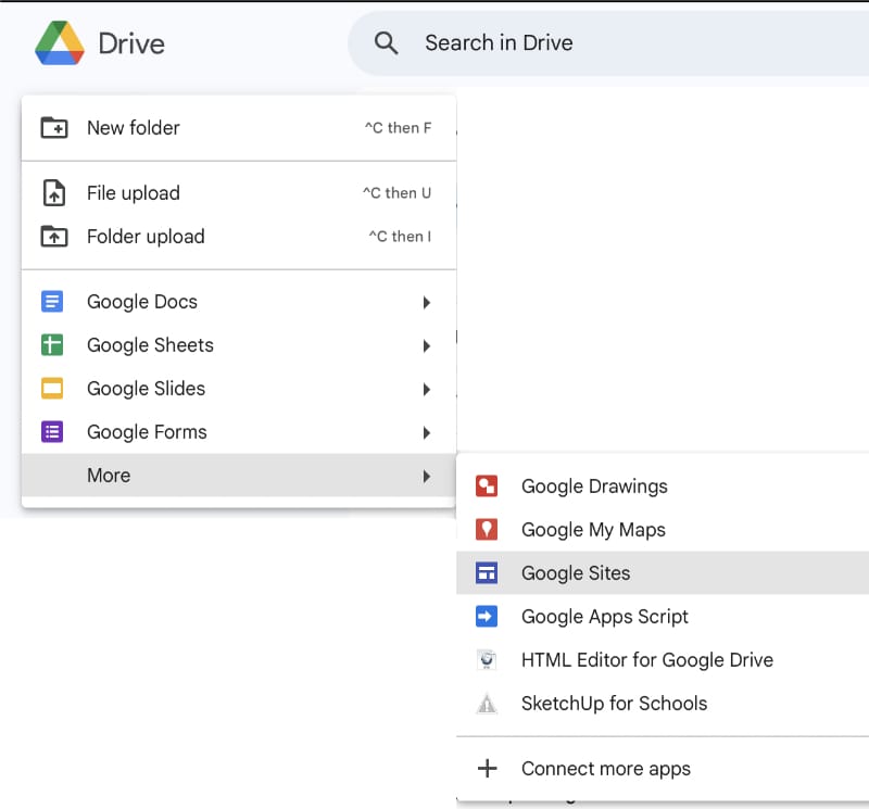 - In het menu dat dan verschijnt zoek je de knop Google sites.